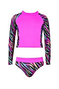 Παιδικό μαγιό μπικίνι σετ με πολύχρωμο τύπωμα στα μανίκια. Μακρυμάνικο τοπ με στρογγυλή λαιμόκοψη και σλιπ με τύπωμα σε όλο το ύφασμα με μεγάλη πίσω κάλυψη. Αυτό το υπέροχο παιδικό μαγιό έχει σχεδιαστεί για να προστατεύει από την ακτινοβολία του ήλιου και το κρύο τα μικρά κορίτσια μας που διασκεδάζουν στο νερό.
