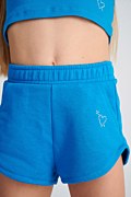 Παιδικό, μονόχρωμο, βαμβακερό φούτερ σορτς. Διαθέτει λάστιχο στη μέση για σταθερή εφαρμογή και πλαϊνές τσέπες. Διακοσμημένο με αστραφτερά στρας σε σχήμα καρδιά, στο μπατζάκι. Κοντό σε μήκος. Κανονική εφαρμογή.