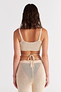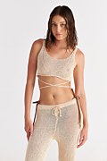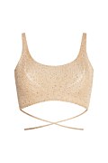 Μονόχρωμη, ημιδιάφανη πλεκτή lurex κοντή μπλούζα με τιράντες, διακοσμημένη με διάσπαρτες παγιέτες σε όλο το ύφασμα. Διαθέτει στρογγυλή λαιμόκοψη και μακριά λεπτά κορδόνια στο πίσω μέρος, τα οποία δένουν χιαστί γύρω από τη μέση. Συνδύασε την με το παντελόνι 25811203 και σίγουρα θα εντυπωσιάσεις με το τέλειο look σου.