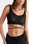 Μονόχρωμη, ημιδιάφανη πλεκτή lurex κοντή μπλούζα με τιράντες, διακοσμημένη με διάσπαρτες παγιέτες σε όλο το ύφασμα. Διαθέτει στρογγυλή λαιμόκοψη και μακριά λεπτά κορδόνια στο πίσω μέρος, τα οποία δένουν χιαστί γύρω από τη μέση. Συνδύασε την με το παντελόνι 25811203 και σίγουρα θα εντυπωσιάσεις με το τέλειο look σου.