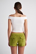 Μονόχρωμη ριμπ μπλούζα σε στενή γραμμή. Διαθέτει ντεκολτέ σε ίσια γραμμή και ακάλυπτους ώμους. *Προτείνεται ένα νούμερο μεγαλύτερο από το συνηθισμένο λόγω της στενής εφαρμογής.