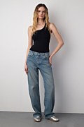 Πεντάτσεπo τζιν παντελόνι σε ίσια γραμμή, με όψη ξεβαμμένου. Xαλαρή εφαρμογή από τη μέση μέχρι τους γλουτούς και φαρδιά εφαρμογή από τους μηρούς μέχρι τα μπατζάκια. Διαθέτει θηλιές για ζώνη, μεσαία μέση και κλείσιμο μπροστά με φερμουάρ και μεταλλικό κουμπί. Ιδανικό για μια άνετη, casual εμφάνιση. Το μοντέλο φοράει μέγεθος 38: Ύψος: 1,77 εκ., Στήθος: 86 εκ., Μέση: 60 εκ., Περιφέρεια: 90 εκ.